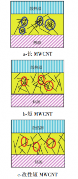 在所有的导热填料中, 以石墨烯和碳纳米管为代表的纳米碳材料的导热性优, 在较少用量的情况下即可赋予硅脂良好的导热性能。yu等人以天然石墨片( nfg) 为原料, 通过化学法合成了石墨烯纳米片(gnp) 和还原氧化石墨烯(rgo), 并利用机械胶体磨法分别将其加入到硅脂 中, 制 备 了 两 种 导 热 硅 脂gnp⁃so 和rgo⁃so, 并 与 以nfg为 导 热 填 料 的 硅 脂(nfg⁃so)进行了对比。发现当导热填料的体积分数为 1%时, rgo对硅脂热导率的提升为明显, rgo⁃so的热导率达到 0.31 w/(mk), 而gnp⁃so和 nfg⁃so的热导率分别为0.26w/(mk)和0.17 w/(mk)。但当导热填料的体积分数超过1.25 %时, rgo⁃so黏度会急剧上升而丧失流动性, 而gnp⁃so黏度上升不明显, 其热导率在gnp用 量 为 4. 25% 时 达 到1.03w/(mk)。guo等人通过热压法制备了以多壁碳纳米管(mwcnt) 为导热填料的硅脂, 发现随着mwcnt长度的缩短, 硅脂热导率升高。这主要是因为 mwcnt较长时(50~60μm), 易于相互缠结成簇, 形成聚集, 且分布没有方向性(见图3), 制得的硅脂热导率仅有 0.57 w/(mk)。当mwcnt长度缩短至2~3 μm 时, 上述缠结明显减少, 且随着导热填料定向分布程度的增强, 硅脂热导率达到2.112w/(mk)。而采用强酸和强碱表面处理mwcnt后, 填料在硅脂中的分散更为均匀, 能够构建更多的导热通路, 硅脂热导率进一步提高至 4.267w/(mk)。