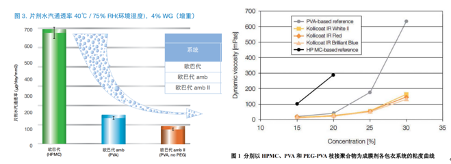 成膜材料除hpmc为常用外,pva(聚乙烯醇)也逐步发展为新一代的成膜剂。pva于hpmc相比,它具有显著的优势,如分子量小(溶液粘度更低,固含量更高,包衣更高效)、氢键结合部位更多(膜抗张强度更大,片芯附着力更强,膜更致密,隔湿隔氧性更强)、分子排列(膜柔韧性更高,膜表面更清晰,更适用于刻字片)等。但是它也有一些缺点,比如因其氢键结合部位更多,形成的包衣膜更为致密,有一定锁水能力,带来的另一问题可能是更易粘片,因此需要更高的片床温度(40℃以上)。为进一步提高包衣效率,又逐渐产生了两种或多种聚合物的共用,以及进一步升级,比如pva-peg的聚合物(kollicoat® ir系列),它拥有很低的成膜温度,因而操作温度范围会更宽。
