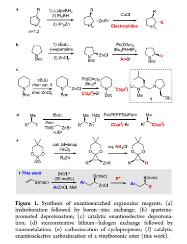 有机锌试剂由于其良好的官能团耐受性和稳定性以及低毒性的特点,被广泛应用于碳碳键和碳杂原子键的构建中。虽然近年来强有力的反应可以利用外消旋试剂进行不对称合成,但是过渡金属催化进一步拓宽了非外消旋有机锌试剂的应用范围。常见的制备有机锌试剂的方法是锌插入到有机卤化物中,但这一过程一般会经过自由基中间体,这使得不对称合成具有挑战性。其他的制备手性有机锌试剂的方法得到了发展。knochel团队发展了硼氢化和随后的硼-锌交换策略得到了手性有机锌试剂(图1a);campos通过脱质子化/转金属化的方法得到了杂环类有机锌试剂(图1b),该策略后来被gawley修改为使用催化量的锂化二氨基醇盐(图1c);近期,knochel团队通过锂-卤素原子交换以及随后的转金属化得到了手性二烷基锌试剂(图1d)。π-键的直接碳锌化是很特别的方法之一,但是被报道得很少,并且仅有具有应力和活化的烯烃可以实现(图1e)。本文,波士顿学院的jamesp. morken发展了手性镍催化剂参与的乙烯基硼酸酯的碳锌化,得到手性α-硼锌试剂,该产物构型稳定可与多种亲电试剂反应得到手性烷基硼酸酯