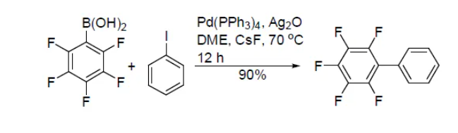它作为配体与许多过渡金属组成金属催化剂,如pd(pph3)4 就是一种重要的催化剂[8],常用于催化偶联反应的进行,是构建碳-碳键的一种重要方法,其特点是催化条件温和。例如,在pd(pph3)4和ag2o的共同作用下,硼酸与芳香卤代烃直接反应生成联类化合物,该反应的产率达到了90%(式8)[9,10]。除了硼酸和卤代物以外,镁试剂[11]、锌试剂[12]、锡试剂[13]、硅化合物[14]等均可作为偶联反应的底物。