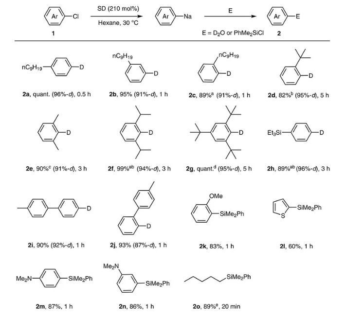 fañanás–mastral等人已经发现2,6-二甲氧基苯基锂可以在pd-peppsi-ipent催化下与1-萘基溴在室温下偶联,以94%的收率得到5a。因此,研究人员也将制备的芳基钠化合物进行同样的反应,发现其都能与另一分子的芳基氯代物或溴代物以很高的收率得到二芳基化合物(除了对甲基氯苯)。如果没有催化剂存在,反应也能得到少量产物,可能是经历了苯炔中间态导致产物以区域异