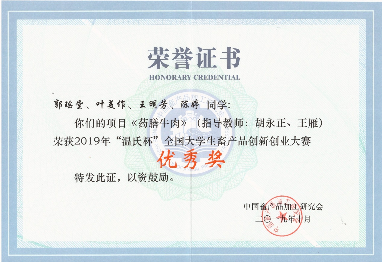 2019年9月25日,由教育部高等学校食品科学与工程类专业教学指导委员会、中国畜产品加工研究会、南京农业大学食品科技学院及广东温氏佳味食品有限公司联合主办的2019年“温氏杯”全国大学生畜产品创新创业大赛,在南京农业大学隆重举行。我院参赛团队取得全国优秀奖的佳绩。