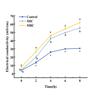 研究分析AEO对P. fluorescens的抗菌活性发现,AEO对P. fluorescens 的MIC为12.5 μl/mL,MBC为25 μl/mL,SEM观察到荧光假单胞菌在2MIC的AEO处理后细胞形态受损严重,菌体大量死亡,显著抑制了细胞生长速率。此外,AEO处理导致AKP酶活性和电导率增加,细胞内核酸和蛋白等大分子成物质明显泄露,证明细胞壁和细胞膜的完整性被破坏。