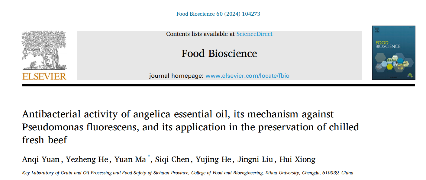 2024年5月6日,365电子娱乐官方网站马嫄教授课题组在1区TOP期刊Food Bioscience(Q1,IF: 5.2)发表题为“Antibacterial activity of angelica essential oil, its mechanism against Pseudomonas fluorescens, and its application in the preservation of chilled fresh beef”的研究性论文。该文第一作者为研究生袁安琪,通讯作者为马嫄教授。