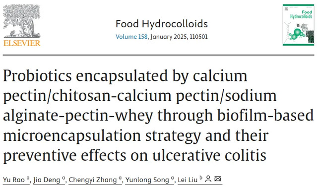 近日,西华大学饶瑜教授团队与兰州大学刘蕾青年研究员团队联合在国际食品Top期刊《Food Hydrocolloids》(Q1,IF: 11.0)发表题为“Probiotics encapsulated by calcium pectin/chitosan-calcium pectin/sodium alginate-pectin-whey through biofilm-based microencapsulation strategy and their preventive effects on ulcerative colitis”的研究性论文。