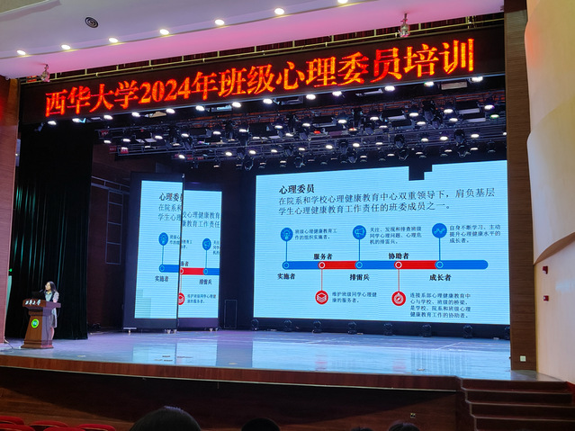 西华大学于2024年9月7日上午9:00在艺术大楼大剧院成功举办了主题为“双重倾听,发掘内在资源”的2024年度班级心理委员培训大会。此次培训旨在提升心理委员的专业素养,强化其倾听与沟通能力,帮助学生更好地理解与管理自己的情绪,发掘个人内在的积极资源,促进校园心理健康文化的建设,培养一支具备专业心理知识和技能的学生队伍,为校园营造更加健康和谐的学习环境。