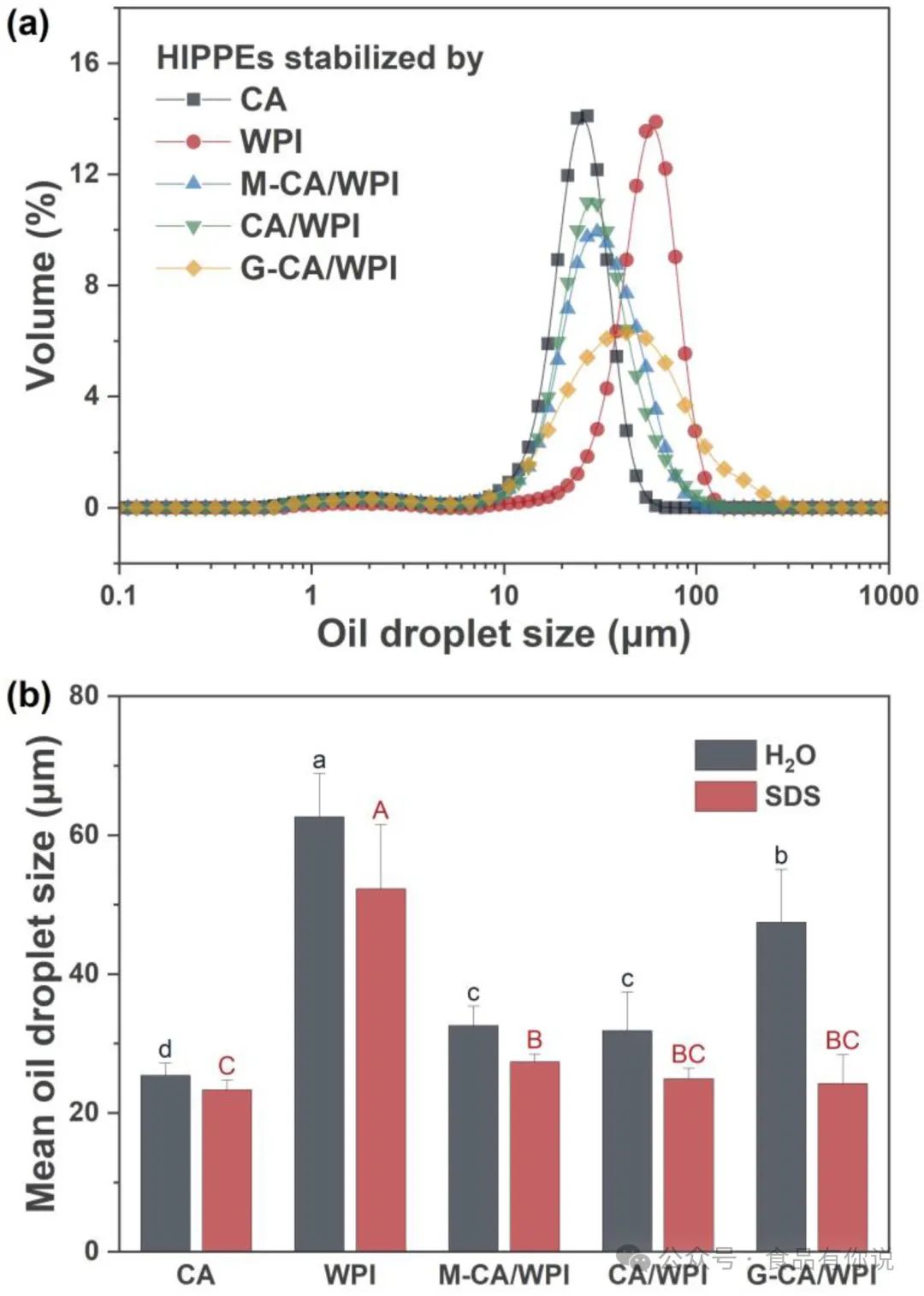 图 6.(a)添加2% CA、WPI、CA/WPI、M-CA/WPI和G-CA/WPI后,HIPPEs中油滴尺寸分布稳定。(b)在ddH2O或SDS中测量的HIPPEs的平均油滴大小。