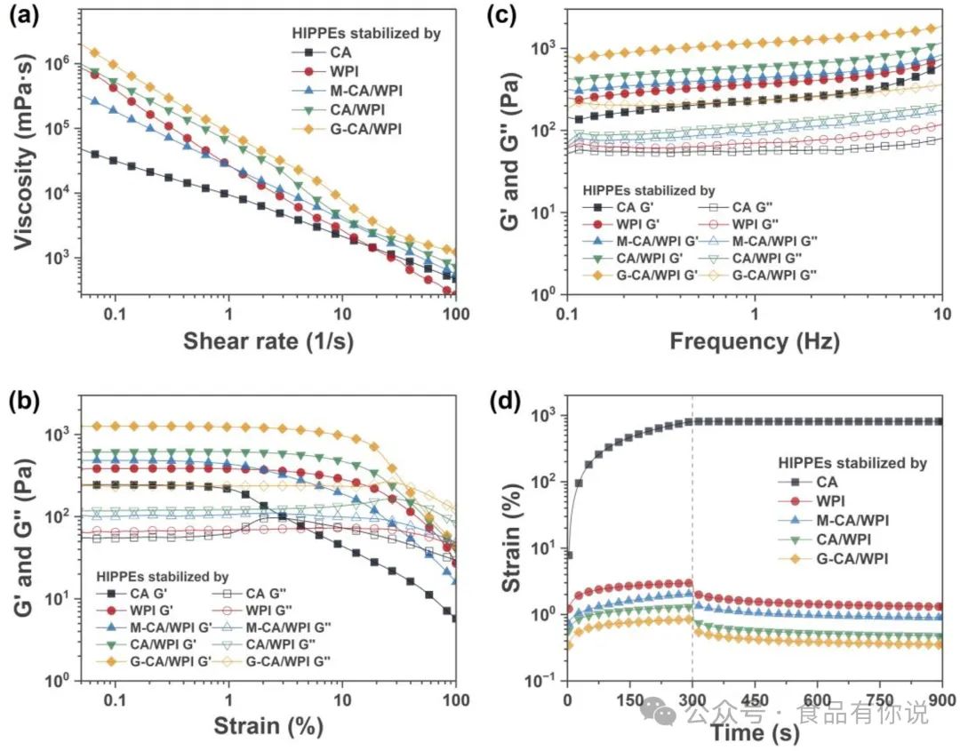 图 8.CA、WPI、CA/WPI、M-CA/WPI和G-CA/WPI稳定HIPPEs的流变特性。(a)表观粘度测量,(b)应变扫描,(c)频率扫描,(d) HIPPEs蠕变恢复曲线。