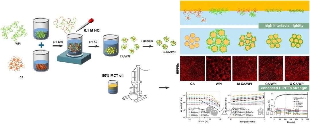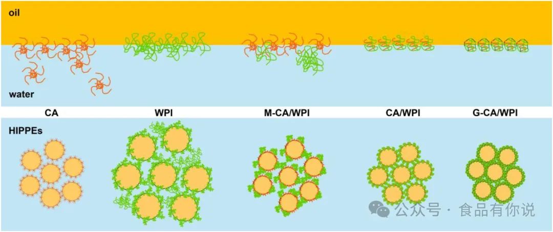 图 10.CA、WPI、CA/WPI、M-CA/WPI和G-CA/WPI吸附的油水界面示意图,以及这些蛋白稳定的HIPPEs。