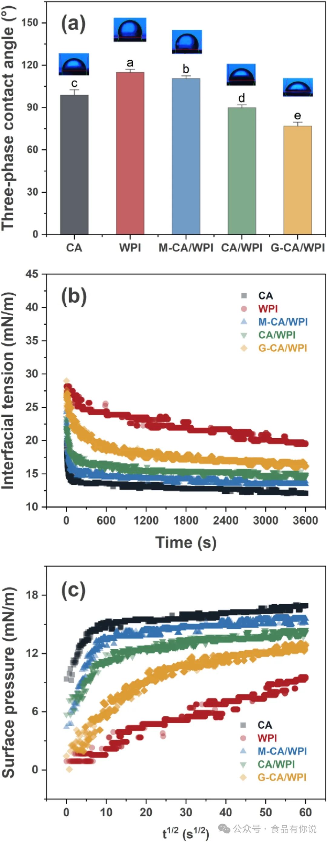 图 3.CA、WPI、M-CA/WPI、CA/WPI、G-CA/WPI油水界面三相接触角(a)、界面张力(b)、界面压力(c)。