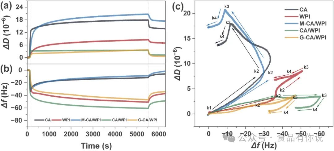 图 4.在CA、WPI、CA/WPI、M-CA/WPI和G-CA/WPI的第三泛音处,归一化频率(a)和耗散(b)随时间的变化而变化。(c)吸附和洗涤过程中第三次泛音的ΔD/Δf图。
