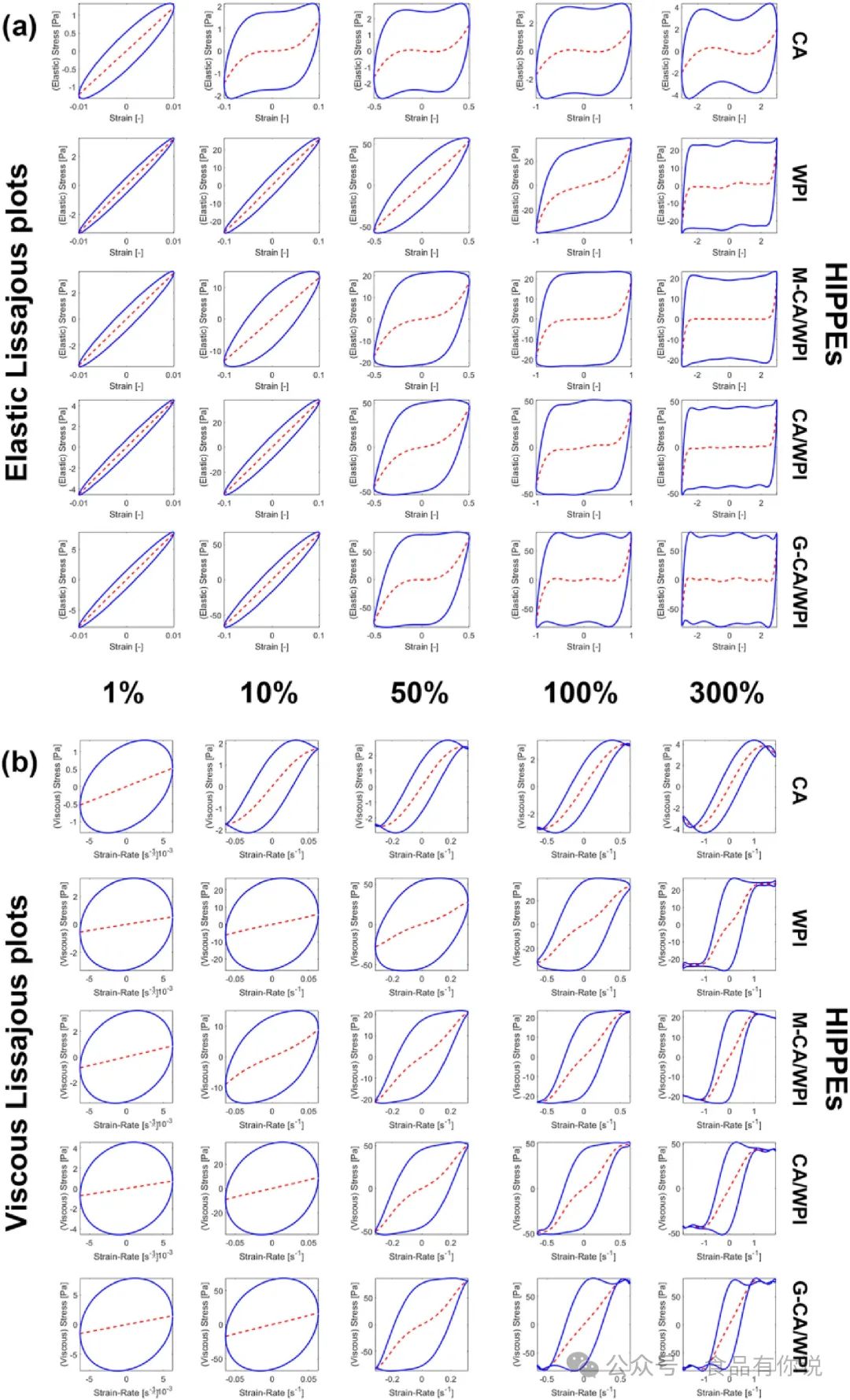 图 9.CA、WPI、CA/WPI、M-CA/WPI和G-CA/WPI稳定的HIPPEs的弹性Lissajous图(a)和粘性Lissajous图(b)。
