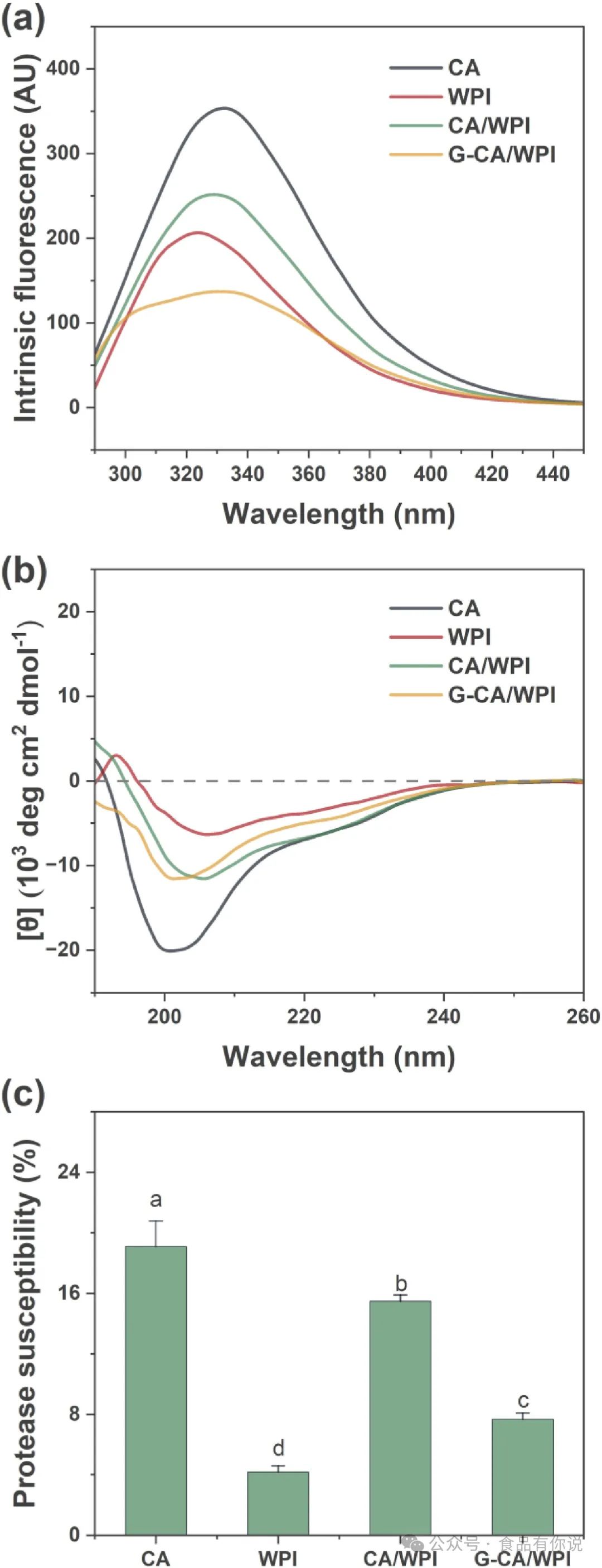图 2.CA、WPI、CA/WPI和G-CA/WPI的本征荧光光谱(a)、圆二色光谱(b)和柔韧性(c)。