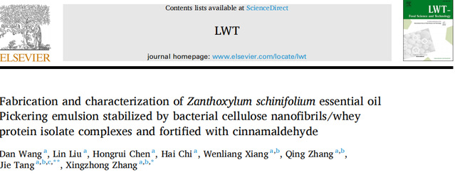 王丹,刘琳,唐洁(通讯作者),张兴中(通讯作者)等在《LWT-Food Science and Technology》期刊中发表的“Fabrication and characterization of Zanthoxylum schinifolium essential oil Pickering emulsion stabilized by bacterial cellulose nanofibrils/whey protein isolate complexes and fortified with cinnamaldehyde”构建了由细菌纤维素纳米纤维/乳清蛋白复合物稳定并用肉桂醛强化的青花椒精油Pickering乳液,并探究了肉桂醛的存在对乳液稳定性和抗抗环境胁迫稳定性的影响,以及精油包埋体系对精油抗氧化活性和抗菌性能的影响。