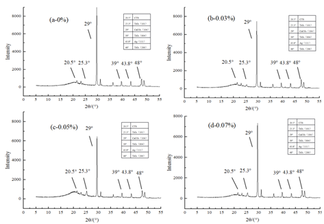 Figure.2. Nano-TiO2 additions (a) 0%, (b) 0.03%, (c) 0.05%, (d) 0.07%, XRD patterns of CTS-TiO2-Ag composite films