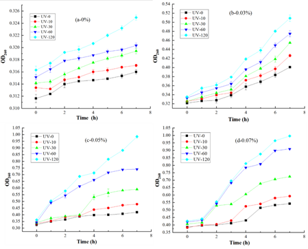 Figure.4. Different time UV illumination of CTS-TiO2-Ag composite film containing of nano-TiO2 inC. gloeosporioides solution OD260 (a) 0%; (b) 0.03%; (c) 0.05%; (d) 0.07%.