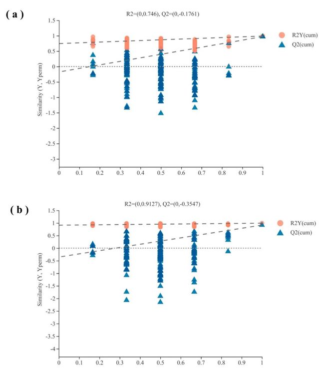 Fig. 7. OPLS-DA replacement verification Con18 vs Con0 (a), Ch18 vs Con18 (b).