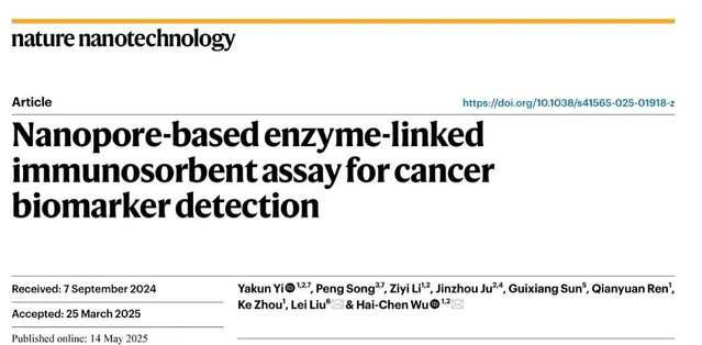 近日,365电子娱乐官方网站刘蕾副教授团队与中国科学院化学研究所吴海臣研究员团队合作,在国际顶级期刊《Nature Nanotechnology》(Q1,IF:38.1)发表题为“Nanopore-based enzyme-linked immunosorbent assay for cancer biomarker detection”的研究论文,365电子娱乐官方网站刘蕾副教授为通讯作者。