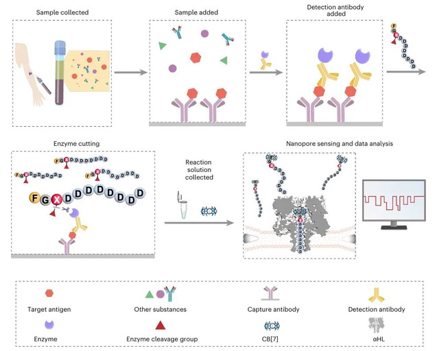 该技术使用了特定的肽探针和酶,通过纳米孔电流信号的变化来定量分析生物标志物。