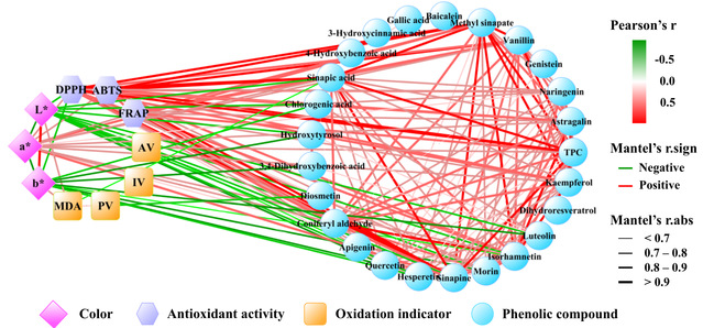 Fig. 5. Correlation network diagram between phenolic compounds and physicochemical properties of RO. The red diamonds, purple hexagons, orange squares, and blue circles represent the color, antioxidant activities, oxidation indicators, and phenolic compounds of RO, respectively. Lines connected these variables, with red lines indicating positive correlations and green lines indicating negative correlations. The line thickness is proportional to the correlation strength, where thicker lines represent stronger associations.