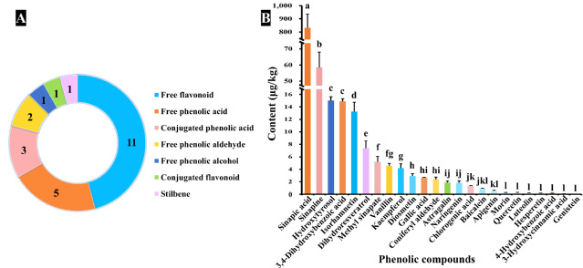 Fig. 1. A: Types and numbers of phenolic compounds detected in RO. B: Contents of different phenolic compounds in RO. Results were expressed as mean values of three repetitions, and different letters in bar chart represent significant differences (p <0.05).