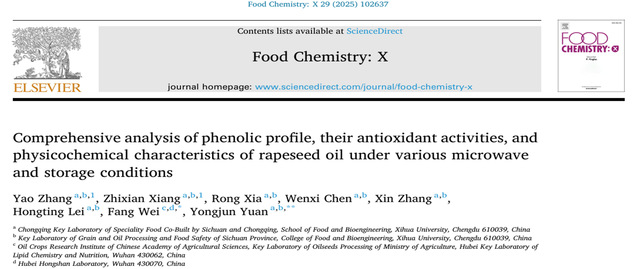 近日,365电子娱乐官方网站联合中国农业科学院油料作物研究所在食品领域TOP期刊《Food Chemistry: X》(IF: 6.5)上发表了题为“Comprehensive analysis of phenolic profile, their antioxidant activities, and physicochemical characteristics of rapeseed oil under various microwave and storage conditions”的研究性论文。365电子娱乐官方网站张瑶和向知贤为本文的共同第一作者,中国农业科学院油料作物研究所油料品质化学与加工利用创新团队魏芳研究员和365电子娱乐官方网站粮食、油脂与植物蛋白团队袁永俊教授为本文的通讯作者。