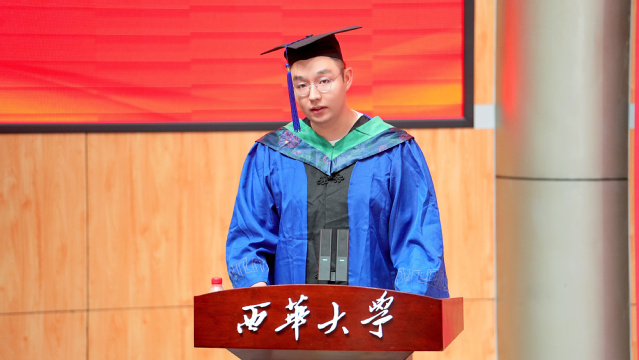 农业专业硕士研究生张良聿作为毕业生代表发言。他深情回顾了在学院学习生活的难忘时光,感谢师长教诲、同窗陪伴,并表示将以专业守护健康中国,用热爱点燃科技星河。