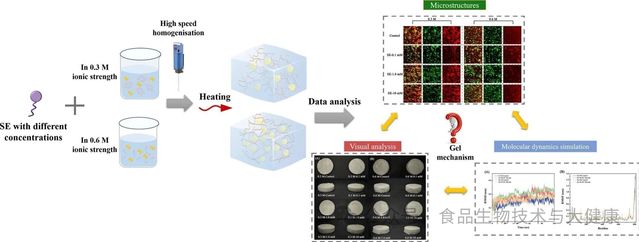 蔗糖酯(SE)是由蔗糖与脂肪酸酯化反应生成的天然低分子量非离子表面活性剂,具有优异的食品安全性与乳化性能。此前的研究发现,将肌原纤维蛋白与蔗糖酯复配使用,可提升肌原纤维蛋白在水相中的分散性及相互作用。因此,结合肌原纤维蛋白的盐依赖性溶解度及蔗糖酯的乳化特性,该研究选取两种具有代表性的离子强度条件(0.3mol/L和0.6mol/L氯化钠)与三个蔗糖酯浓度梯度(0.1mmol/L、1.0mmol/L和10mmol/L),旨在系统性阐明乳化体系与凝胶体系之间“液-固”相变的潜在机制,为乳化肉制品的质地创新提供具有参考价值的理论依据。