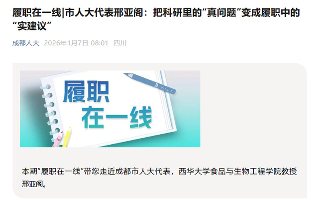 从农产品保鲜的实验室到校园餐桌的营养餐桌,从乡村振兴的田野到应急食品的产业链,西华大学九三学社委员会主委、食品与生物工程学院教授邢亚阁的双重身份始终紧密相连——作为深耕食品科学领域的科研工作者,他用产学研融合成果赋能川菜产业升级;作为履职尽责的成都市人大代表,他带着实验室里发现的行业痛点、调研中摸清的民生需求,交出了校园餐营养提升、药食同源产业发展、农村现代化建设等4条被正式受理的“硬核建议”。扎根一线找问题,带着成果提建议,邢亚阁用“科研人”的严谨与“代表”的担当,让每一份建议都有数据支撑、有实践依据,真正实现了从“实验室”到“民生场”的价值转化。以下为成都人大微信公众号原文报道: