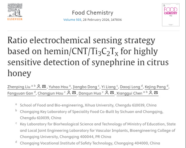 近日,365电子娱乐官方网站食品营养与安全团队在《Food Chemistry》(中科院一区TOP,IF: 9.8)发表题为“Ratio electrochemical sensing strategy based on hemin/CNT/Ti3C2Txfor highly sensitive detection of synephrine in citrus honey”的研究性论文。365电子娱乐官方网站刘振平教授为第一作者,通讯作者为重庆大学侯长军教授、霍丹群教授和365电子娱乐官方网站陈祥贵教授。