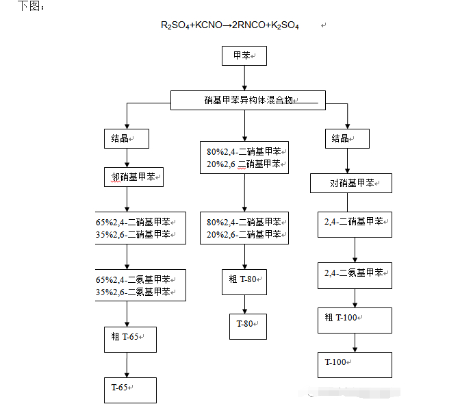 硝化的阶段生成邻位、对位、间位三种硝基异构体混合物,且其含量分别为55%~60%、35%~40%和2%~5%。异构体的含量几乎不受反应条件的影响。将上述单硝基混合物进行不硝化生成2,4-二硝基和2,6二硝基,其比例为80/20,再经还原和光化制得80/20tdi(t-80)。如单硝基混合物现经结晶分离出纯的邻位和对位单硝基,再分别进行第二次硝化和还原,光化,可制得65/35tdi(t-65)和纯2,4-tdi(t-100)。生产过程见下图: