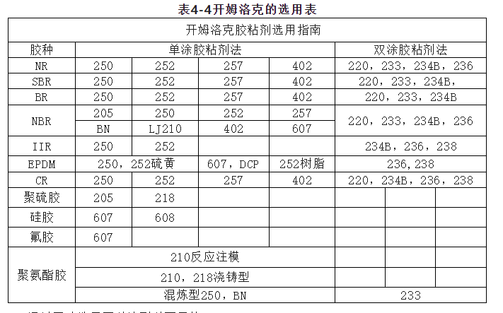 9,产品使用要求 开姆洛克胶粘剂的耐环境性一般都优于橡胶,但不同开姆洛克品种之间存在着一些差异,要求耐溶剂性的产品选用bn为好,要求高耐油性产品以ch252为宜,要求高耐热性产品应选用ch233/ch205或ch252。
