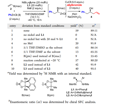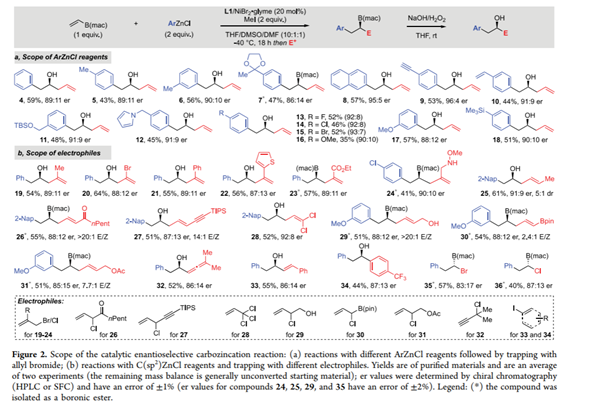 有机锌试剂由于其良好的官能团耐受性和稳定性以及低毒性的特点,被广泛应用于碳碳键和碳杂原子键的构建中。虽然近年来强有力的反应可以利用外消旋试剂进行不对称合成,但是过渡金属催化进一步拓宽了非外消旋有机锌试剂的应用范围。常见的制备有机锌试剂的方法是锌插入到有机卤化物中,但这一过程一般会经过自由基中间体,这使得不对称合成具有挑战性。其他的制备手性有机锌试剂的方法得到了发展。knochel团队发展了硼氢化和随后的硼-锌交换策略得到了手性有机锌试剂(图1a);campos通过脱质子化/转金属化的方法得到了杂环类有机锌试剂(图1b),该策略后来被gawley修改为使用催化量的锂化二氨基醇盐(图1c);近期,knochel团队通过锂-卤素原子交换以及随后的转金属化得到了手性二烷基锌试剂(图1d)。π-键的直接碳锌化是很特别的方法之一,但是被报道得很少,并且仅有具有应力和活化的烯烃可以实现(图1e)。本文,波士顿学院的jamesp. morken发展了手性镍催化剂参与的乙烯基硼酸酯的碳锌化,得到手性α-硼锌试剂,该产物构型稳定可与多种亲电试剂反应得到手性烷基硼酸酯