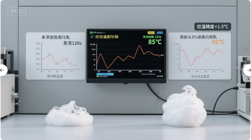 • 延迟催化剂改变了泡沫上升的动力学曲线。其核心在于将反应高峰(最大放热速率点)的出现时间适度延后,并可能降低峰值强度。