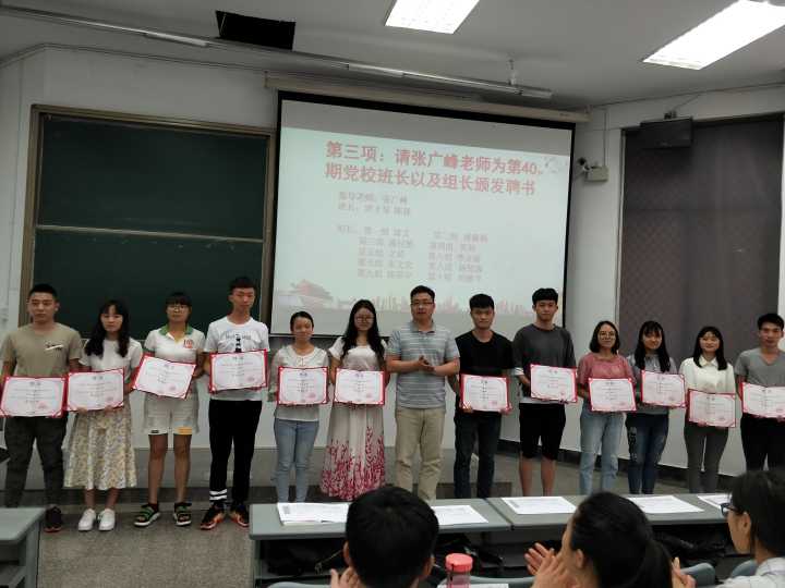 张广峰发表讲话,要求同学必须端正自己的入党动机,严格按照学校、学院的要求,踏踏实实、认认真真地学习党课知识;随后张广峰为党校班长、组长颁发聘书,并鼓励党校班长、组长们积极认真的做好工作,站好每一班岗;党校班长罗才琴、陈强讲解党校学习期间和课后自主学习过程的要求,并强调相关纪律要求,要求全体学员严格要求自己。