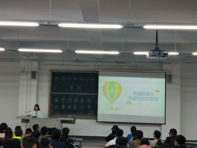 11月12日中午12:30,食品与生物工程学院第十六届美寝大赛动员大会在6b-208隆重举行,莅临大会的嘉宾有校团委副书记兼学院团委书记刘洪老师、学院学工办王雁老师、胡永正老师、陈锦老师。参加此次动员大会的还有各班班委、各寝室代表、学院学生会全体同学。