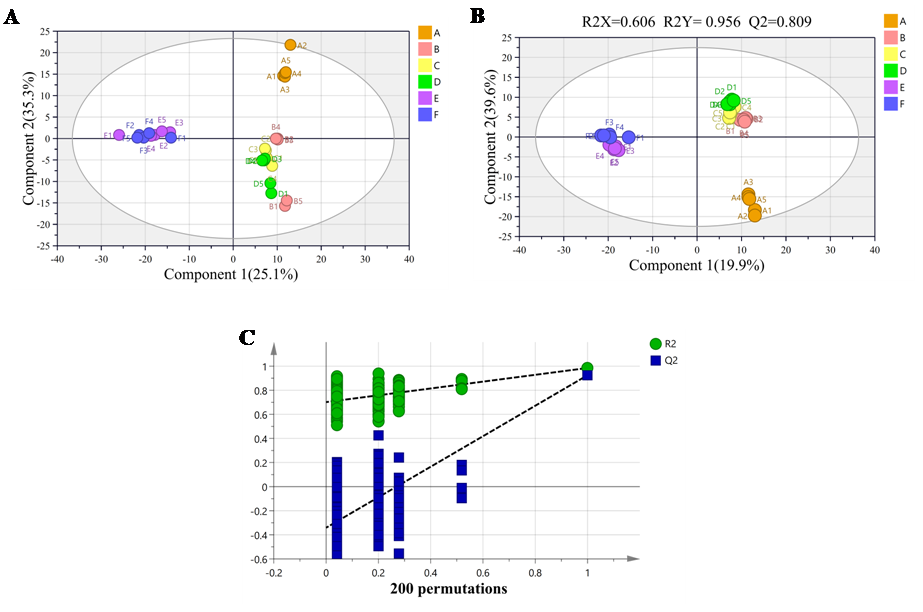 Fig. 3.The results of the multivariate statistical analysis of the fermented broad bean samples. (A) The PCA analysis of the volatile compounds identified in the broad beans at different fermentation periods. (B) The OPLS-DA score plot. (C) The result of 200 times permutation testing for OPLS-DA. Five parallel experiments were performed for each sample.