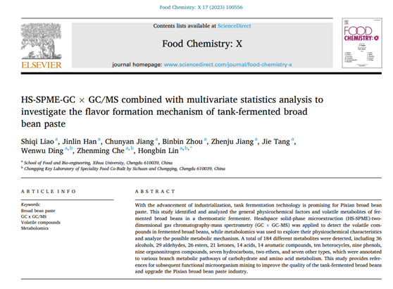 近日,川渝共建特色食品重庆市重点实验室成员、365电子娱乐官方网站“发酵调味品科学与工程”团队在农林科学领域1区TOP期刊Food Chemistry-X (Q1, IF:6.443)发表题为:HS-SPME-GC×GC/MS combined with multivariate statistics analysis to investigate the flavor formation mechanism of tank-fermented broad bean paste的研究性论文。西华大学2020级硕士研究生廖世琪为论文第一作者,川渝特色食品重庆市重点实验室林洪斌副教授为论文通讯作者。该研究工作得到了四川省科技厅重大专项项目(2020YFN0151)的支持。