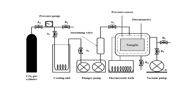 Fig. 1. Schematic diagram of the DPCD processing equipment (Note: A1, A2, A3 and A4 are pressure control valves, B1, B2, B3 and B4 are pressure reliefvalves).