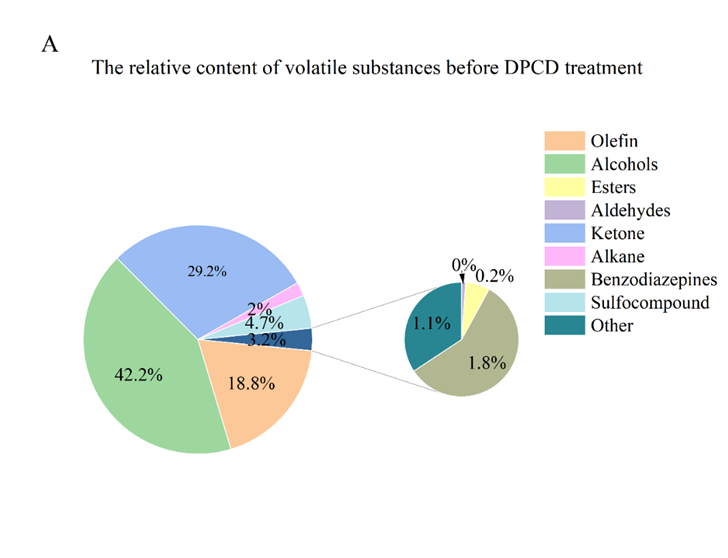 Fig. 3. Changes of volatile flavor components of new-paocai before and after DPCD treatment (25 MPa, 40 °C, 40 min). (A) The relative contents of compound species before DPCD treatment. (B) The relative contents of compound species after DPCD treatment. (C) Principal component analysis based on the GC-MS data set of new-paocai with (or without) the DPCD treatment.