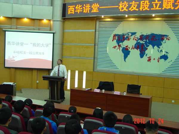 2012年10月24日晚7时,成都成彭高速公路有限责任公司总经理段立赋先生做客我校西华讲堂,为生物工程学院学子带来一场题为“我的大学”的励志讲座。讲座由生物工程学院党委书记周彬儒主持,学院部分青年教师聆听了此次讲座。