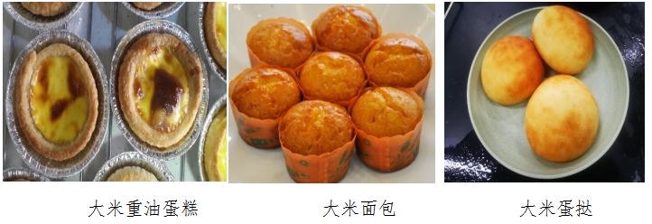 本项目利用稻米加工的副产物-碎米为只要原料,开发大米面包、大米曲奇、大米海绵蛋糕、大米蛋挞、大米薄饼等系列主食以及休闲米制食品。现有市场上的米制食品中,大米粉的添加量不超过10%,否则会对产品的品质产生负面影响,比如大米面包起发性差,体积小;大米曲奇和大米蛋糕口感粗糙,吞咽困难等。因此,本项目采用了生物酶制剂改良、复合调理等技术,使得大米粉的添加量达到30%以上,这样减少了产品中面粉的用量,增加米粉的用量,大大降低了麸质的含量,并且碎米为原材料,极大地降低了成本。制备得到的大米面包和曲奇饼干具有浓郁的米香,大米蛋挞的保质期优于市场产品。