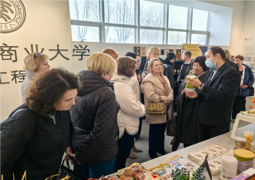 访问期间,代表团参观了学院科研成果展厅。特色食品加工工艺、稻米精深加工关键技术等科研成果,以及格瓦斯饮品、大米曲奇等系列产品,吸引了代表团成员。遇世友教授详细介绍了这些成果的原理和产品应用前景,让代表团直观感受到学院的科研实力,他们认为这些成果对俄方食品行业发展有重要参考价值。